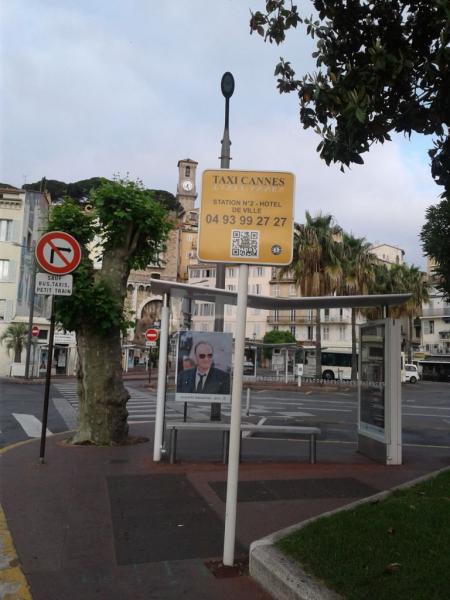 Ένα χρήσιμο νούμερο στην πλατεία του Δημαρχείου των Καννών. Στο πόστερ, πίσω από την ταμπέλα ένας σκηνοθέτης που έχει γράψει ιστορία στις Κάννες με το «Pulp Fiction». Ο Κουέντιν Ταραντίνο.