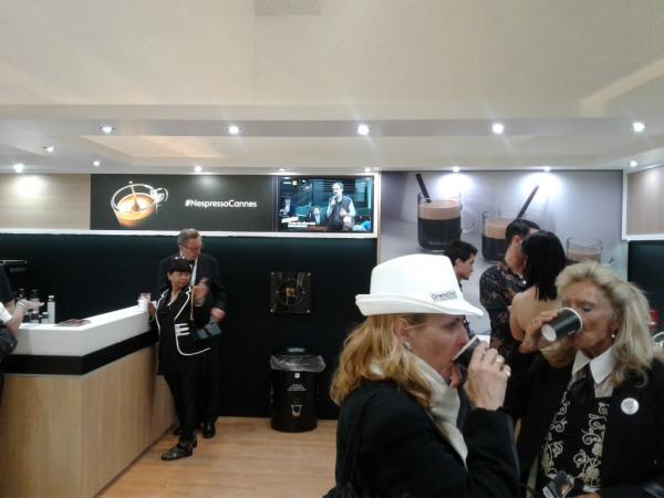Ένα από τα καλά του φεστιβάλ είναι ότι προσφέρει δωρεάν καφέ (ποικίλλων χαρμανιών) γιατί συνεργάζεται με τη Nespresso. Συμπτωματικά, στη οθόνη της τηλεόρασης, διακρίνομαι εγώ από τη συνέντευξη Τύπου της ταινίας Under the Silver Lake