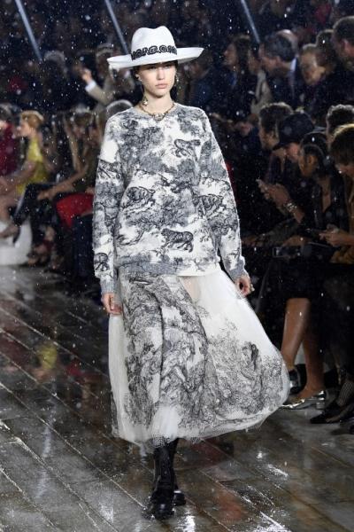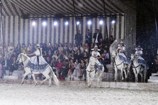 Η Μαρία Γκρατζιά Τσιούρι , η Ιταλίδα σχεδιάστρια του οίκου, αποφάσισε να φέρει μια νότα λατινοαμερικάνικης διάθεσης στους βασιλικούς στάβλους του Domaine de Chantilly, ξεκινώντας το σόου της για την καλοκαιρινή κολεξιόν του Christian Dior το βράδυ της Παρασκευής με μια ομάδα γυναικών μεξικάνικων δρομέων rodeo να εντάσσουν τους καλεσμένους στο θέμα της βραδιάς. Φορώνταςκεντημένα ασπρόμαυρα φορέματα, ειδικά φτιαγμένα από τον Dior, η έφιπη συμμορία έδωσε έναν δυναμικό τόνο στην έναρξη της βραδιάς! Οι «δραματικές» στιγμές δεν τελείωσαν στην έναρξη αλλά συνεχίστηκαν και κατά την διάρκεια της επίδειξης , καθώς μια δυνατή καταιγίδα ξέσπασε στιγμές πριν από την έναρξη της επίδειξης, «δροσίζοντας» τα μοντέλα καθώς έκαναν πασαρέλα στον ημι-ανοιχτό χώρο. Οι καλεσμένοι άνοιξαν δελτία παραγγελιών, ατζέντες και ομπρέλες και επειδή show must go on, τα μοντέλα είχαν πάρει θέσεις και οι διοργανωτές είχαν πάθει φρενίτιδα!