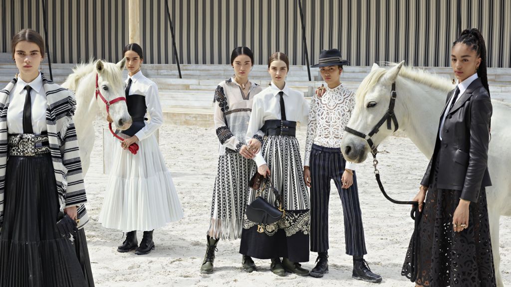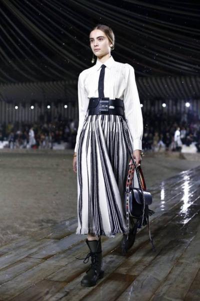 Μια κολεξιόν, που θα έκανε την Μάρλεν Ντίτριχ πολύ χαρούμενη, συνέχισε με παρόμοιες δημιουργίες και στα πλαίσια της γυναικείας χειραφέτησης , που από πέρυσι η σχεδιάστρια έχει βάλει στην ατζέντα του οίκου, o οίκος Dior αποφάσισε φέτος να ντύσει την σύγχρονη αμαζόνα. Παλιά σχέδια του ίδιου του ιδρυτή, Christian Dior, ήρθαν πάλι στην ζωή μέσα στους στάβλους της γαλλικής πόλης και οι γραμμές με έντονα λούκια για την ιππασία μπορούν να φορεθούν με ένα άσπρο πουκάμισο στο γραφείο. Ψηλόμεσα σορτς και μοτίβα με έθνικ αναφορές από παλιές γαλλικές αποικίες αποτυπώθηκαν σε λευκές μεταξωτές φούστες και δαντελένια φορέματα. Αναμφισβήτητα πρόκειται για μια κολεξιόν με πολιτικό μήνυμα και αναβίωση ιστορικών αρχείων του οίκου. Οι γυναίκες μπορούν να ιππεύουν με φούστα σε αυτήν την πασαρέλα, αλλά την έχουν διαλέξει οι ίδιες! Η βροχή σταμάτησε και οι σαμπάνιες πήραν θέση στα καλλιτεχνικά πηγαδάκια. Οι τάσεις είναι όπως τα άλογα. Είναι ευκολότερο να τις οδηγείς προς τα κει που κατευθύνονται.