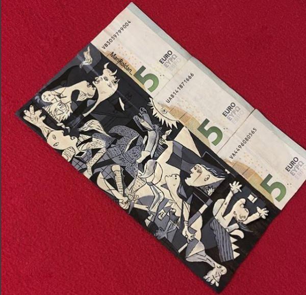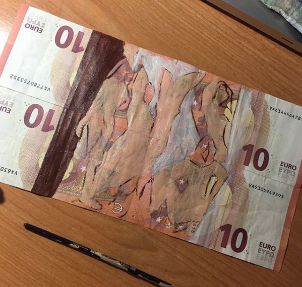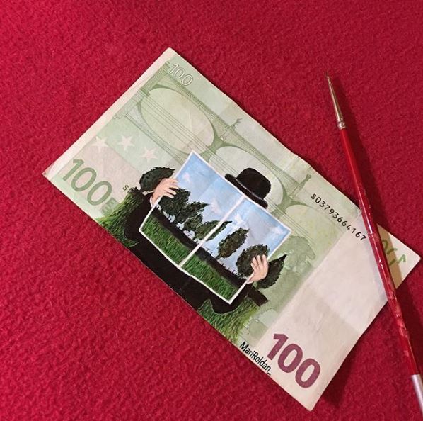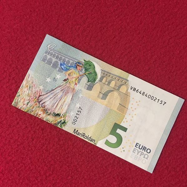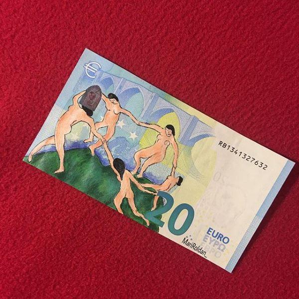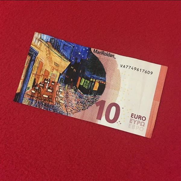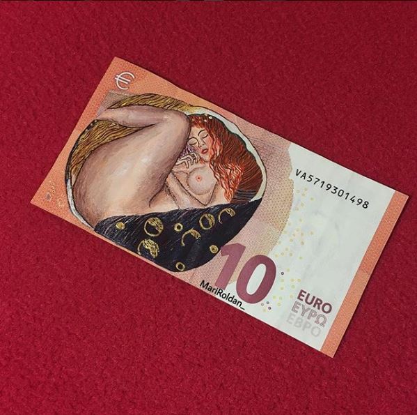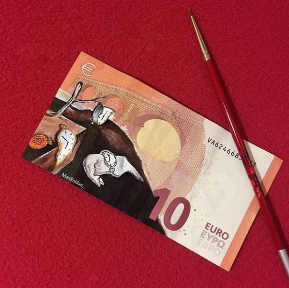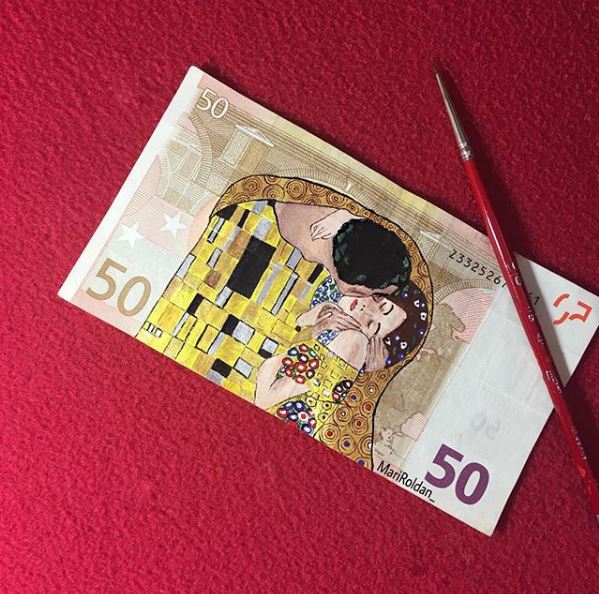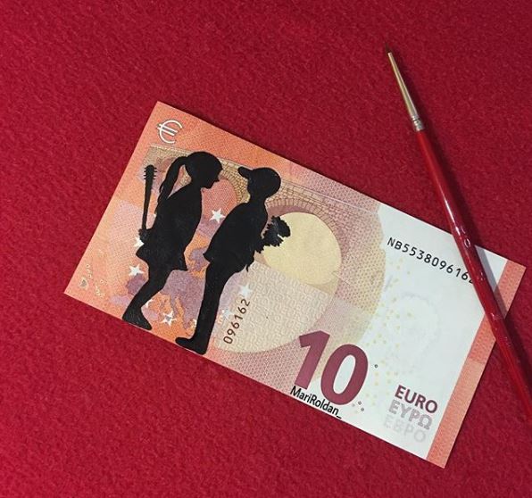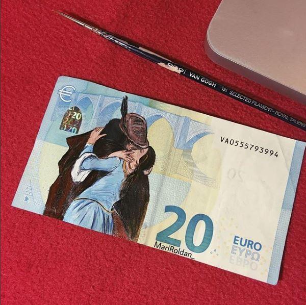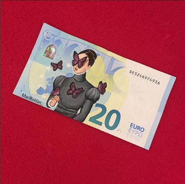 Οι ζωγράφοι επιλέγουν οι ίδιοι τα θέματα που θα δημιουργήσουν, αλλά και τον καμβά που θα χρησιμοποιήσουν. Η νεαρή Mari Roldan επέλεξε για το δεύτερο κάτι το ασυνήθιστο: χαρτονομίσματα του ευρώ.