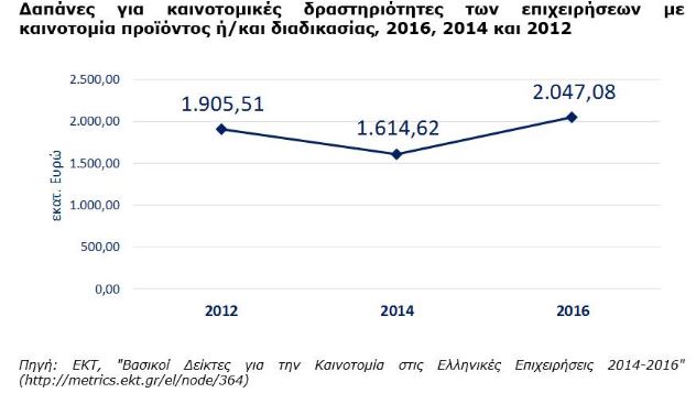 Οι επενδύσεις των επιχειρήσεων για την ανάπτυξη καινοτομιών σε προϊόντα ή/και διαδικασίες ξεπέρασαν τα 2 δισ. ευρώ το 2016 (2.047,08 εκατ. ευρώ), μεγαλύτερες κατά 432,5 εκατ. ευρώ σε σχέση με το 2014 και κατά 141,6 εκατ. ευρώ σε σχέση με το 2012.