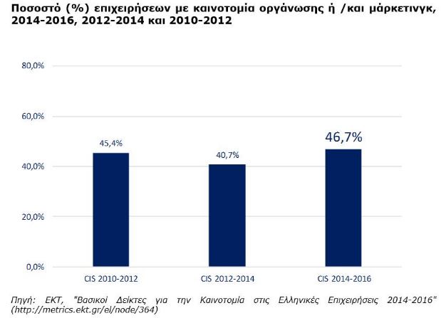 Καινοτομίες σε οργάνωση ή/και μάρκετινγκ κατέγραψε το 46,7% των ελληνικών επιχειρήσεων, σημειώνοντας άνοδο 6,1% σε σχέση με την τριετία 2012-2014 και 1,4% σε σχέση με την τριετία 2010-2012.