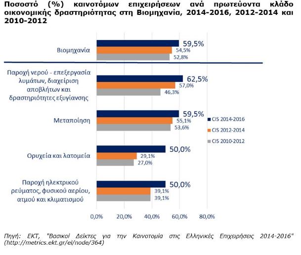 Όσον αφορά τους επιμέρους κλάδους οικονομικής δραστηριότητας, στον τομέα της Βιομηχανίας το ποσοστό καινοτομίας φθάνει το 59,5% για την περίοδο 2014-2016, εμφανίζοντας βελτίωση των επιδόσεων από το 54,5% την περίοδο 2012-2014 και το 52,8% την περίοδο 2010-2012.