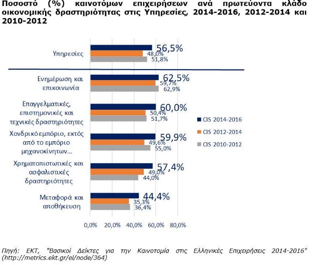 Το ποσοστό των καινοτόμων ελληνικών επιχειρήσεων για την τριετία 2014-2016 ανήλθε στο 57,7%, έναντι ποσοστού 51% στην τριετία 2012-2014 και 52,3% στην τριετία 2010-2012.