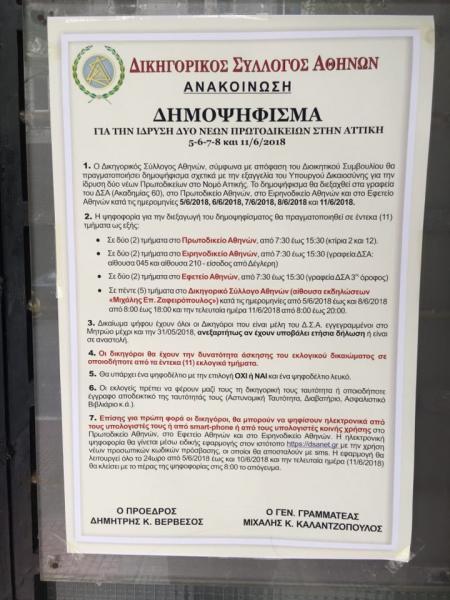 Δημοψήφισμα διεξάγει από σήμερα και για τις 6, 7, 8 και 11 Ιουνίου ο Δικηγορικός Σύλλογος Αθηνών προκειμένου το σώμα των δικηγόρων να τοποθετηθεί και δια της ψήφου του στην κυβερνητική πρόθεση για διάσπαση του Πρωτοδικείου της Ευελπίδων σε δύο ακόμη Πρωτοδικεία, ενώ μελετάται και το ενδεχόμενο ηλεκτρονικής ψηφοφορίας, ώστε να το όποιο αποτέλεσμα να είναι κατά το δυνατόν το πιο αντιπροσωπευτικό του δικηγορικού σώματος.