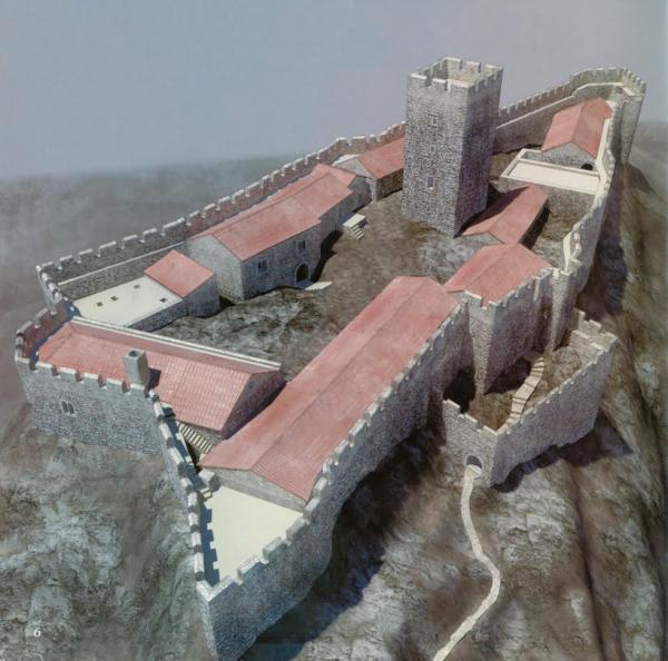 Σχεδιαστική απεικόνιση του Κάστρου της Καρύταινας, το οποίο έχει τριγωνική κάτοψη, που ακολουθεί το ανάγλυφο του εδάφους, συνολικό μήκος περί τα 110 μ. και πλάτος 40 μ. Ο εντυπωσιακός πύργος στο κέντρο του και τα κτίσματα δεν έχουν διασωθεί