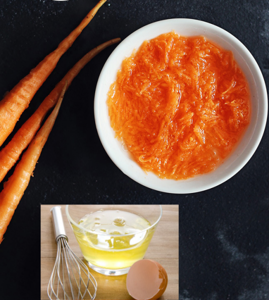 Συνδυάστε το αυγό, το καρότο και την αλόη βέρα σε ένα μικρό μπολ. Χτυπήστε το μείγμα μαζί με ένα πιρούνι (περίπου για 1 λεπτό).