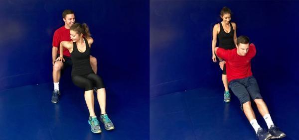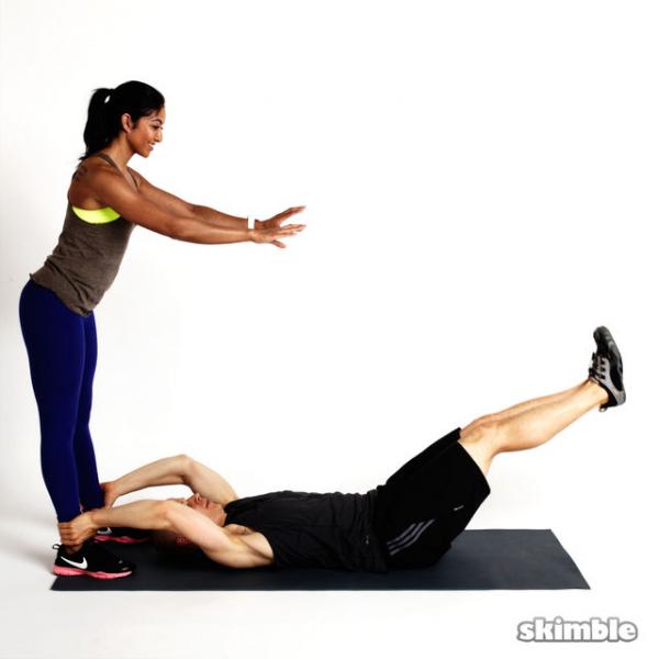Ο ένας μένει όρθιος με τα πόδια ελαφρώς ανοιχτά στο μήκος των ώμων και κάνει καθίσματα. Ο άλλος ξαπλώνει με τεντωμένα πόδια και τα σηκώνει σε γωνία 90 μοιρών κρατώντας με τα χέρια του τους αστράγαλους του συντρόφου.