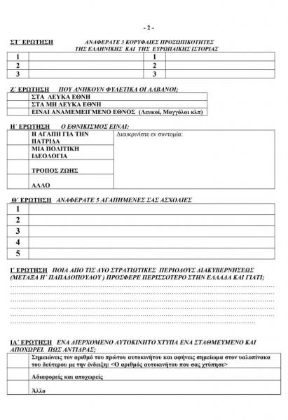Το ερωτηματολόγιο, που δημοσίευσε ο 902.gr, είναι ένα… τεστ αποδοχής νέων μελών στη ναζιστική οργάνωση. Θέτει ερωτήματα πολλαπλών επιλογών, όπως: «Πού ανήκουν φυλετικά οι Αλβανοί;» και δίνει σαν πιθανές απαντήσεις: Στα Λευκά έθνη, στα μη λευκά έθνη, είναι αναμεμειγμένο έθνος (Λευκοί, Μογγόλοι κλπ).