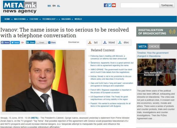 Όπως μεταδίδουν σκοπιανά μέσα ενημέρωσης, ο Ιβανόφ κατηγόρησε τον Ζάεφ ότι διαπραγματεύεται ανεύθυνα και πρόχειρα με τον Αλέξη Τσίπρα κι ότι δεν επιδεικνύει την σοβαρότητα που απαιτείται σε ένα τόσο ευαίσθητο ζήτημα.