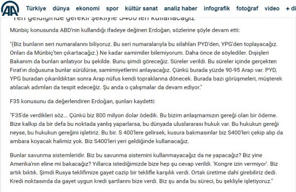 «Δεν θα αγοράσουμε τους S-400 για να τους βάλουμε σε αποθήκη. Θα τους χρησιμοποιήσουμε στην ανάγκη. Είναι ένα αμυντικό σύστημα. Τι να το κάνουμε αν δεν το χρησιμοποιήσουμε», είπε αρχικά στα πλαίσια διακαναλικής συνέντευξης Τύπου στα ιδιωτικά δίκτυα TGRT Haber, TVNET, Beyaz TV και Αkit TV και συνέχισε πετώντας εξαπολύοντας επίθεση στις ΗΠΑ: «Θα βασιζόμαστε και πάλι στις ΗΠΑ; Χρόνια τους το ζητάμε κι απάντηση που μας δίνουν είναι: »δεν το επιτρέπει το κογκρέσο». Έχουμε κουραστεί μ’ αυτά».