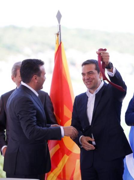 Με μια συμβολική κίνηση του Ζόραν Ζάεφ προς τον Αλέξη Τσίπρα ολοκληρώθηκε η τελετή υπογραφής της συμφωνίας για το ονοματολογικό της ΠΓΔΜ.
