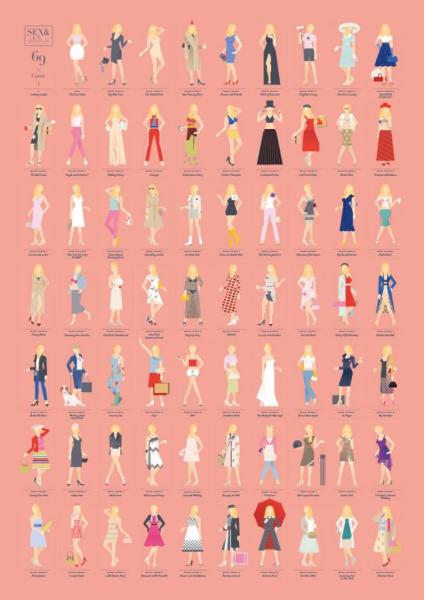 Επέτειος του «Sex and the City», εικοστά γενέθλια, και οι σχεδιαστές γραφιστικών Εουριντίκα Κάτα και Ραφάλ Σαβίνσκι σκέφτηκαν να τα γιορτάσουν με έναν πρωτότυπο τρόπο: ένα πόστερ με τις 69 πιο σημαντικές εμφανίσεις της Κάρι Μπράντσο, ίσως της πιο βασικής ηρωίδας της τηλεοπτικής σειράς.