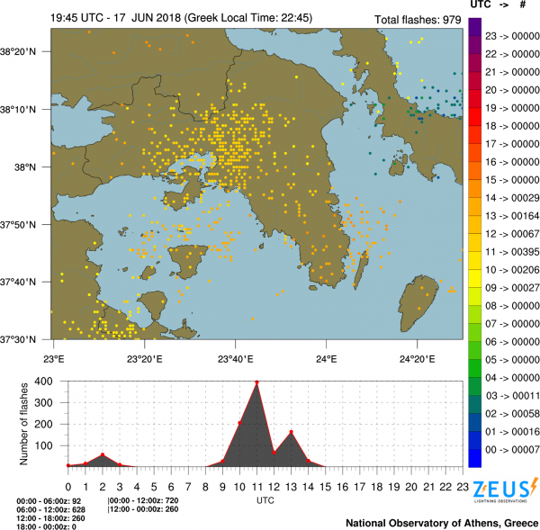 Ο δεύτερος χάρτης δίνει την κατανομή των κεραυνών που κατέγραψε το σύστημα ΖΕΥΣ, με περίπου 1000 κεραυνούς στην ευρύτερη περιοχή.