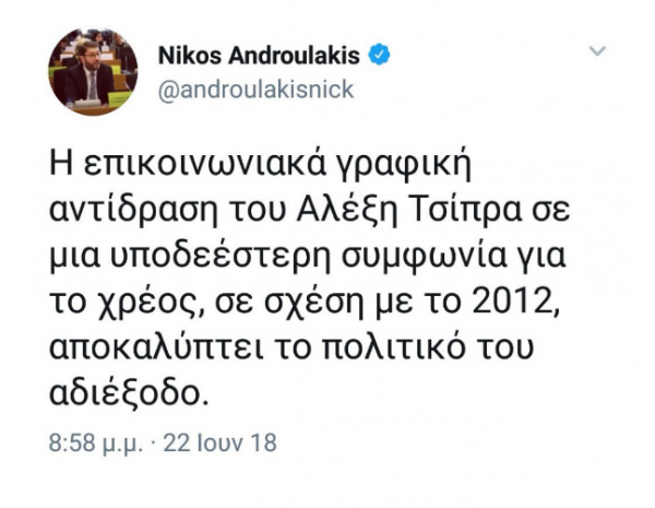 Σχολιάζοντας την γραβάτα που φόρεσε ο πρωθυπουργός και την ομιλία του στο Ζάππειο, ο ευρωβουλευτής τόνισε: «H επικοινωνιακά γραφική αντίδραση του Αλέξη Τσίπρα σε μια υποδεέστερη συμφωνία για το χρέος, σε σχέση με το 2012, αποκαλύπτει το πολιτικό του αδιέξοδο».