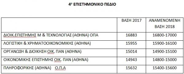 Η βάση στο 4ο Πεδίο Σπουδών Οικονομίας και πληροφορικής κινείται στα περυσινά επίπεδα με μικρές αποκλίσεις. Σε όλες τις Παιδαγωγικές Σχολές η βάση θα εκτοξευθεί πολύ προς τα πάνω, σε πολλές μάλιστα θα προσεγγίσει και τα 3.000 μόρια. Γενικά φέτος εγκαινιάστηκε ένα νέο σύστημα θεματοδότησης που οι μαθητές εκτός βέβαια από την απομνημόνευση που δυστυχώς συνεχίζεται, σε όλα τα μαθήματα υπήρχαν και ερωτήματα που απαιτούσαν κριτική ικανότητα ώστε να ξεχωρίσουν οι αριστούχοι που φέτος είναι λιγότεροι από τους περυσινούς.