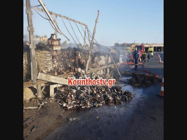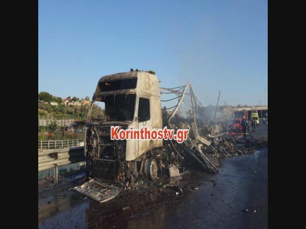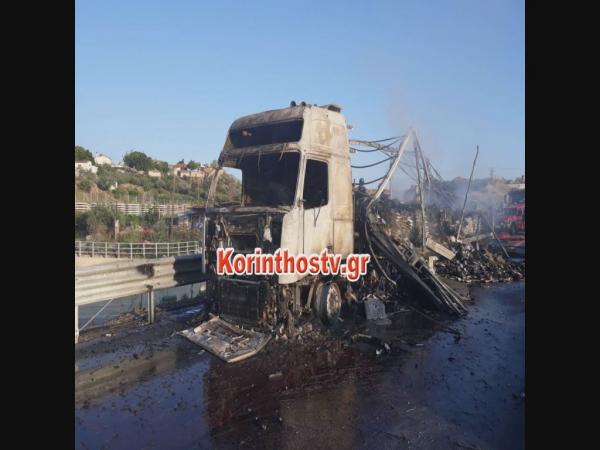 Νταλίκα κάηκε ολοσχερώς στην εθνική οδό Αθηνών-Κορίνθου [Εικόνες]