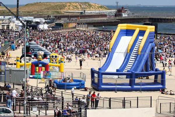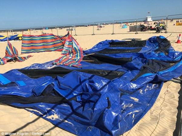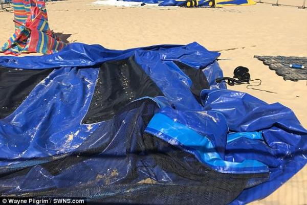 Ο ιδιοκτήτης του φουσκωτού κάστρου, διαθέτει ένα τραμπολίνο, μια φουσκωτή τσουλήθρα και ένα ροντέο στην παραλία.