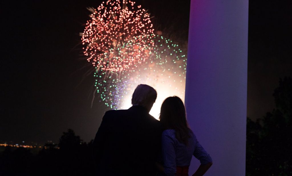 Ο αμερικανός πρόεδρος στο μπαλκόνι του Λευκού Οίκου μαζί με την Μελάνια παρακολουθούν τα πυροτεχνήματα αγκαλιασμένοι, ενώ την ίδια στιγμή ο Τραμπ γέρνει το κεφάλι του προς το μέρος της.