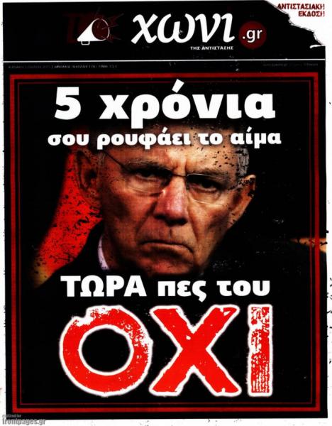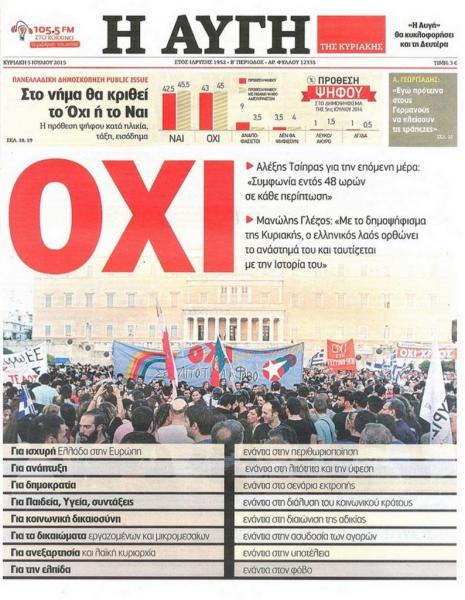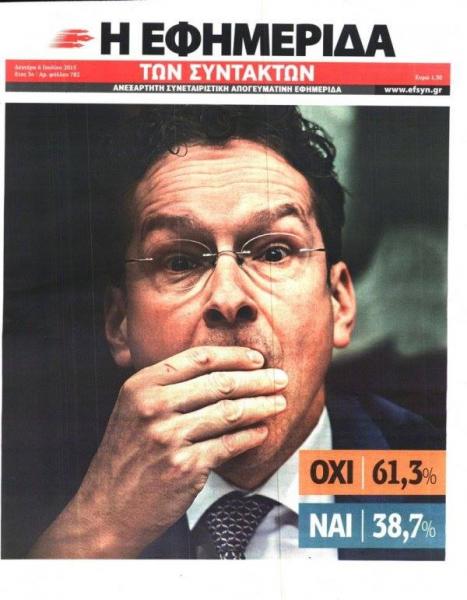 Στο ιστορικό αυτό δημοψήφισμα, οι πολίτες απέρριψαν με ποσοστό 61,3% την πρόταση του σχεδίου συμφωνίας των δανειστών, ωστόσο γρήγορα ο Αλέξης Τσίπρας το μετέτρεψε σε «ναι», με τη δικαιολογία ότι η Ελλάδα πρέπει να παραμείνει στην Ευρωζώνη, αν και το δίλημμα των πολιτών ήταν «νέο μνημόνιο ή όχι».