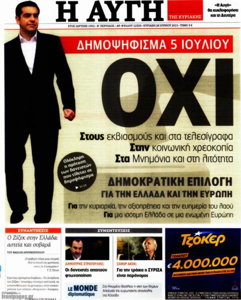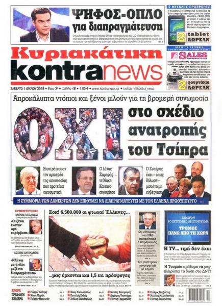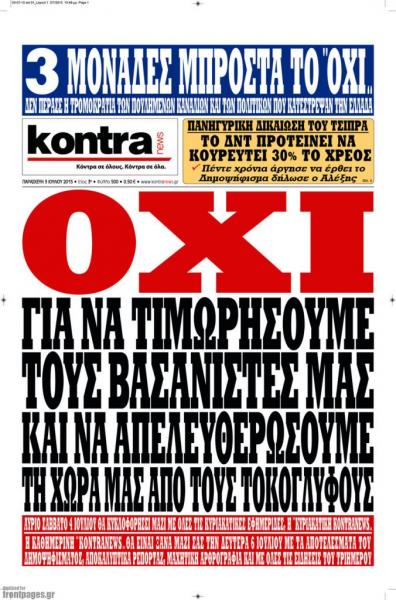 Εχει ιδιαίτερο ενδιαφέρον να θυμηθούμε πώς αντιμετώπιζαν τα γεγονότα λίγο πριν αλλά και την ημέρα της «γιορτής της Δημοκρατίας», στις 5 Ιουλίου 2015. Αν κάνει κάποιος σύγκριση με τα σημερινά πρωτοσέλιδα των ίδιων εφημερίδων θα καταλάβει γιατί ο Αλέξης Τσίπρας πριν από λίγες ημέρες είπε mea culpa για το δημοψήφισμα.