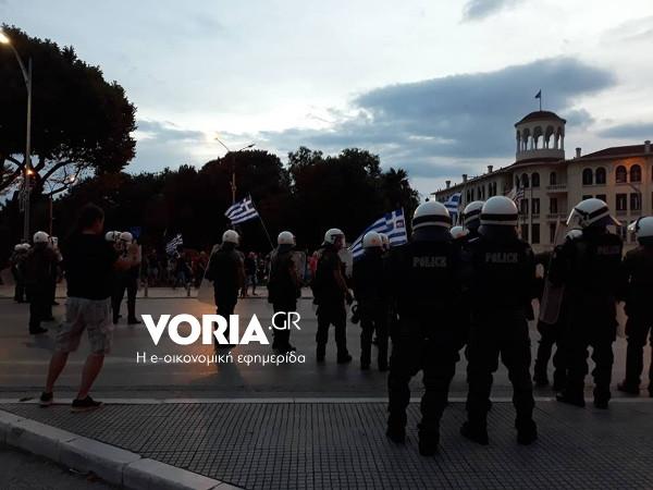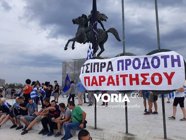 Νωρίτερα το απόγευμα της Κυριακής, οι συγκεντρωμένοι έστησαν μικροφωνική στη Ν. Παραλία, κρατούσαν σημαίες, φώναζαν συνθήματα κατά της κυβέρνησης και του Αλέξη Τσίπρα, ενώ ανήρτησαν πανό στο μνημείο του Μ. Αλεξάνδρου που έγραφε «Τσίπρα προδότη παραιτήσου».