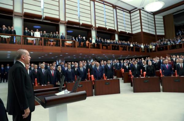 Kατά την άφιξή του στο τουρκικό κοινοβούλιο, τον Ρετζέπ Ταγίπ Ερντογάν, τον οποίο συνόδευε η σύζυγός του Εμινέ, υποδέχθηκαν με χειροκροτήματα οι βουλευτές της συμμαχίας του όπου επικρατεί το κόμμα του