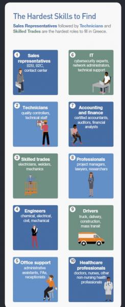 Για ένατη συνεχή χρονιά, οι εργοδότες στην Ελλάδα αντιμετωπίζουν τη μεγαλύτερη δυσκολία στην κάλυψη θέσεων στον τομέα των «Επαγγελματιών Πωλητών», ενώ ακολουθεί η ειδικότητα των «Τεχνικών», η οποία βρισκόταν στην 6η θέση της κατάταξης το 2016. Την 3η θέση καταλαμβάνουν οι «Εξειδικευμένοι Τεχνίτες», ειδικότητα που βρισκόταν στην 3η θέση της κατάταξης το 2016. Σύμφωνα με τα ευρήματα της έρευνας, η ειδικότητα των «Επαγγελματιών Υγείας», καθώς και οι «Εξειδικευμένοι Υπάλληλοι Γραφείου», εισέρχονται για πρώτη φορά στη λίστα των 10 θέσεων εργασίας με τη μεγαλύτερη δυσκολία κάλυψης στην Ελλάδα. Συγκριτικά με τη λίστα των 10 θέσεων του 2016, εκτός κατάταξης βρίσκεται η ειδικότητα που αφορά στο «Προσωπικό για το χώρο Εστίασης και Ξενοδοχείων», καταλαμβάνοντας την 8η θέση για το 2016.
