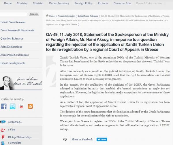 Σε ανακοίνωσή του το τουρκικό υπουργείο Εξωτερικών σημειώνει πως «η υπόθεση έφτασε έως το Ευρωπαϊκό Δικαστήριο Ανθρώπινων Δικαιωμάτων, το οποίο δικαίωσε την ΤΕΞ, με συνέπεια το 2017 η ελληνική Βουλή να υπερψηφίσει τροπολογία που θεωρητικά θα επέτρεψε την επαναφορά της Ένωσης στο παλαιότερο καθεστώς».