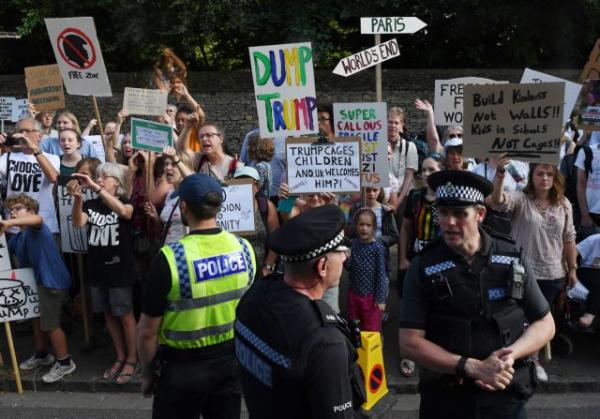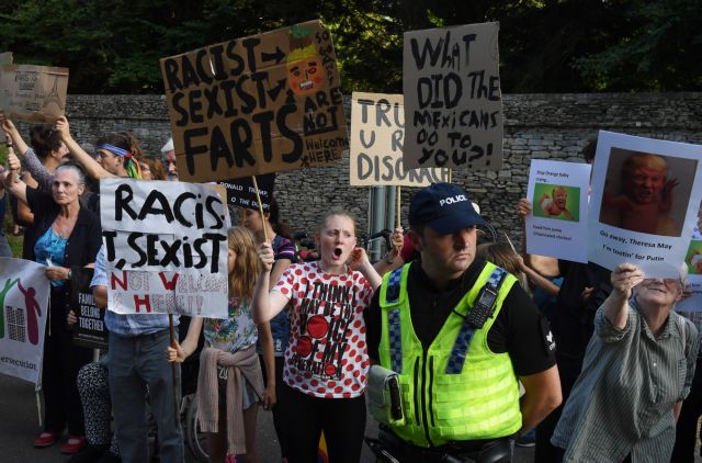 «Ντόναλντ Τραμπ δεν είσαι ευπρόσδεκτος!» ήταν ένα από τα συνθήματα που επαναλάμβαναν ρυθμικά οι διαδηλωτές, οι οποίοι συγκεντρώθηκαν κοντά στην πύλη του Ουίνφιλντ Χάουζ, της κατοικίας του πρέσβη των ΗΠΑ στο Ρίτζεντς Παρκ, όπου ο αμερικανός ηγέτης θα διανυκτερεύσει απόψε με τη σύζυγό του Μελάνια.