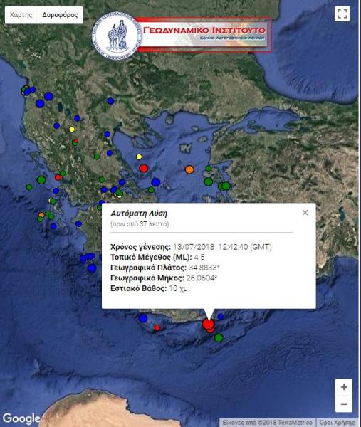Σύμφωνα με το Γεωδυναμικό Ινστιτούτο Αθηνών, ο σεισμός σημειώθηκε στις 15:42, με επίκεντρο θαλάσσιο χώρο νότια της Ιεράπετρας στην Κρήτη.