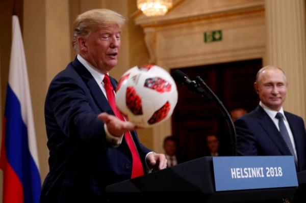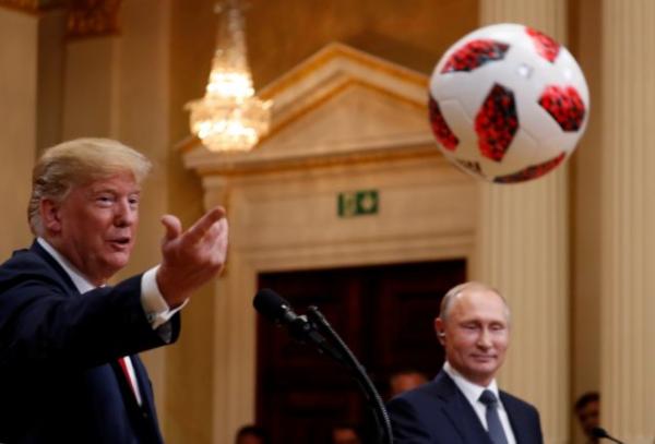 Μια μπάλα ήταν το δώρο, εμφανώς επηρεασμένο από το Μουντιάλ που ολοκληρώθηκε στα γήπεδα της Ρωσίας, του Βλαντιμίρ Πούτιν στον Ντόναλντ Τραμπ λίγο πριν το τέλος της συνέντευξης Τύπου που είχαν οι δυο ηγέτες στα πλαίσια της συνάντησης τους, στο Ελσίνκι