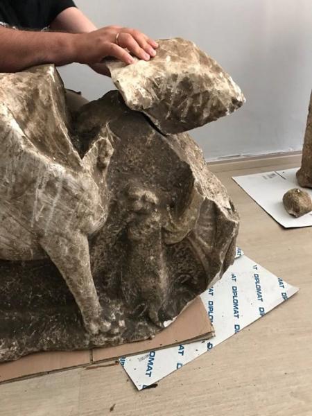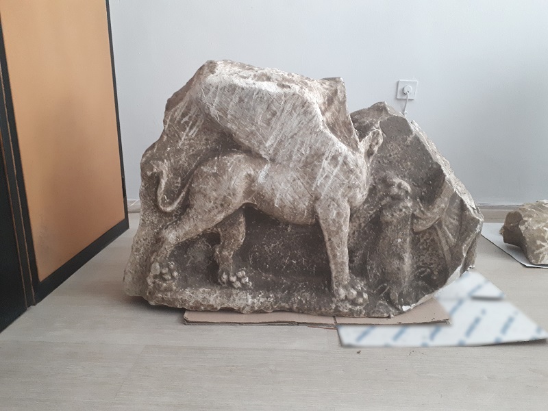 -τμήμα από την στενή πλευρά μαρμάρινης ανάγλυφης σαρκοφάγου με παράσταση μυθολογικού όντος, με σώμα λιονταριού και φτερά πουλιού (πιθανόν γρύπας), του οποίου δεν σώζεται η κεφαλή (σωζόμενου πλάτους 90 εκατοστών, σωζόμενου ύψους 66 εκατοστών και πάχους 20 εκατοστών), η οποία χρονολογείται κατά την ρωμαϊκή περίοδο και πιο συγκεκριμένα μεταξύ του 2ου και 3ου αιώνα μ.Χ.,