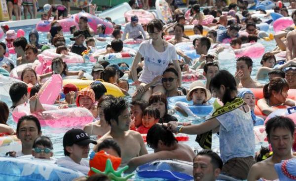 Οι επισκέπτες σκόνταψαν ο ένας τον άλλον σε μια πισίνα στο πάρκο ψυχαγωγίας Toshimaen στο Τόκιο, Ιαπωνία.