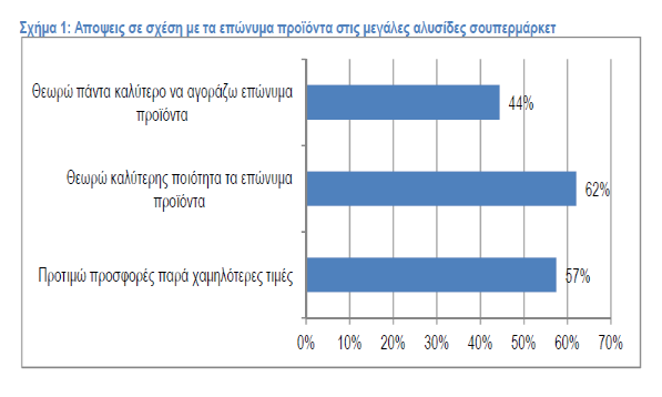Η πλειοψηφία των καταναλωτών στην έρευνα καταναλωτών του ΙΕΛΚΑ περίπου 2 στους 3 (62%) θεωρεί καλύτερα ποιοτικά τα επώνυμα προϊόντα, με 1 στους 2 καταναλωτές να δηλώνει ότι είναι πάντα καλύτερο να αγοράζει επώνυμα προϊόντα. Σημαντικό ρόλο σε αυτή την εξέλιξη έχουν παίξει και οι πολλές και έντονες προσφορές που καταγράφονται τα τελευταία χρόνια στην ελληνική αγορά, με τις οποίες τα επώνυμα προϊόντα προσφέρονται σε ιδιαίτερα ανταγωνιστικές τιμές ακόμα και σε σχέση με τις φθηνότερες επιλογές των προϊόντων ιδιωτικής ετικέτας. Χαρακτηριστικό είναι ότι πλέον οι Έλληνες καταναλωτές σε ποσοστό 57% δηλώνουν ότι προτιμούν περισσότερες προσφορές – κάτι στο οποίο επενδύουν τα επώνυμα προϊόντα – παρά χαμηλές τιμές – κάτι στο οποίο έχουν πλεονέκτημα τα προϊόντα ιδιωτικής ετικέτας.