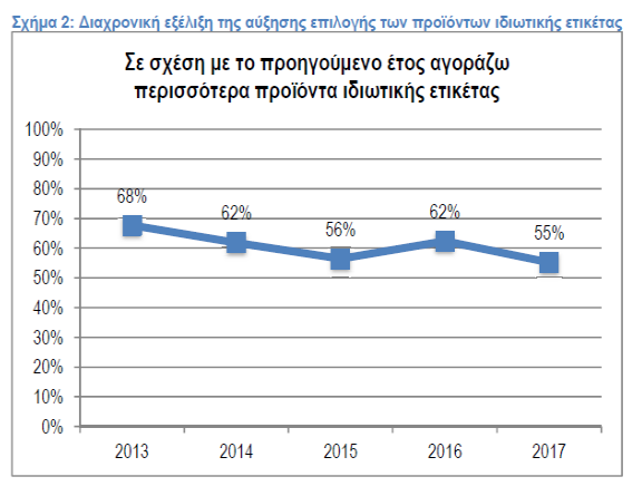 Παράλληλα με αυτά τα δεδομένα όμως η πλειοψηφία των καταναλωτών εξακολουθεί να αυξάνει τον αριθμό προϊόντων ιδιωτικής ετικέτας που δοκιμάζει-επιλέγει, αλλά με φθίνοντα ρυθμό. Το στοιχείο αυτό δείχνει τόσο ότι διαχρονικά, έστω και με αργά βήματα, αυξάνεται η διείσδυση των προϊόντων αυτών στα καλάθια των καταναλωτών, αλλά κυρίως ότι υπάρχουν περιθώρια περαιτέρω αύξησης αυτής της υπάρχουσας διείσδυσης.