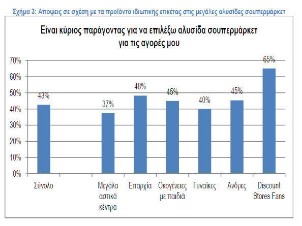 Ο βαθμός διείσδυσης όμως των προϊόντων PL αντικατοπτρίζεται σε άλλα στοιχεία της έρευνας με εντονότερη τη δήλωση των καταναλωτών σε ποσοστό 43% ότι τα προϊόντα ιδιωτικής ετικέτας είναι κύριος παράγοντας για να επιλέξουν αλυσίδα σουπερμάρκετ για τις αγορές τους. Αυτό το στοιχείο δείχνει ότι τα PL αποτελούν πλέον μέρος της εταιρικής ταυτότητας της αλυσίδας σουπερμάρκετ και αποτελούν μέρος της εικόνας τους προς το καταναλωτικό κοινό. Αξίζει να σημειωθεί ότι αυτή η τάση είναι πιο έντονη για συγκεκριμένες ομάδες του κοινού. Στα μεγάλα αστικά κέντρα η τάση αυτή δεν είναι τόσο έντονη όσο στην επαρχία. Άνδρες και οικογένειες με παιδιά επίσης τείνουν να δίνουν μεγαλύτερη σημασία στην επιλογή των προϊόντων αυτών. Αλλά το σημείο που πραγματικά ξεχωρίζει είναι ότι το cluster των καταναλωτών που αγοράζει συστηματικά και επιλέγει συχνά discount store είναι με μεγάλη διαφορά αυτό που επηρεάζεται περισσότερο στην επιλογή αλυσίδας σουπερμάρκετ από το τι προϊόντα ιδιωτικής ετικέτας περιμένει να βρει. Είναι σαφές ότι υπάρχει μία σημαντική ευκαιρία για τις λιανεμπορικές επιχειρήσεις στην Ελλάδα να επιτύχουν ανταγωνιστικό πλεονέκτημα με στη σωστή στρατηγική για τα προϊόντα με τα οποία θα ταυτιστούν.