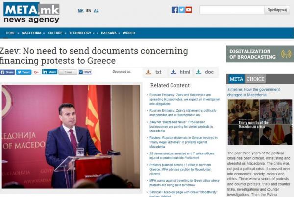 Σε συνέντευξή του στο «BuzzFeed News», ο πρωθυπουργός της γείτονος κατήγγειλε ότι «έλληνες επιχειρηματίες που διάκεινται ευνοϊκά προς τις ρωσικές θέσεις» κατέβαλαν σε πολίτες της ΠΓΔΜ ποσά από 13.000 δολάρια έως 21.000 δολάρια για να «διαπράξουν βίαιες ενέργειες» εν όψει του κρίσιμου δημοψηφίσματος για τη συμφωνία των Πρεσπών.