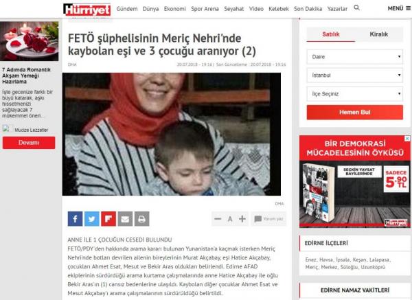 Ο σύζυγος της Χατισέ, Μουράτ Ακτζαμπάι, απηύθυνε έκκληση για να ενταθούν οι έρευνες των αρχών αλλά και για βοήθεια από όποιον μπορεί. «Το όνομά μου είναι Μουράτ Ακτσαμπάι. Η σύζυγός μου είναι η Χατίτζε Ακτσαμπάι. Και οι δύο είμαστε δάσκαλοι. Όταν περνούσαμε τον ποταμό Έβρο, η βάρκα μας ανατράπηκε στη μία της 18ης Ιουλίου 2018. Η σύζυγός μου και τα τρία παιδιά μου, ηλικίας ενός, τεσσάρων και έξι ετών χάθηκαν στο ποτάμι. Ως πατέρας ικετεύω τον ελληνικό λαό και τις ελληνικές αρχές. Σας παρακαλώ μην σταματήσετε την επιχείρηση έρευνας και διάσωσης».