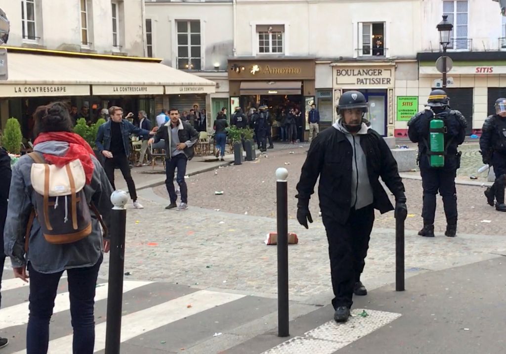 Σε ένα βίντεο, ένας άνδρας που φορά αστυνομικό κράνος και αναγνωριστικό σήμα φαίνεται να τραβά μια γυναίκα και στη συνέχεια να χτυπά έναν διαδηλωτή την 1η Μαΐου. Αργότερα ταυτοποιήθηκε ως μέλος του προσωπικού της γαλλικής προεδρίας.