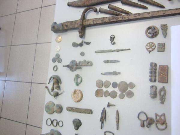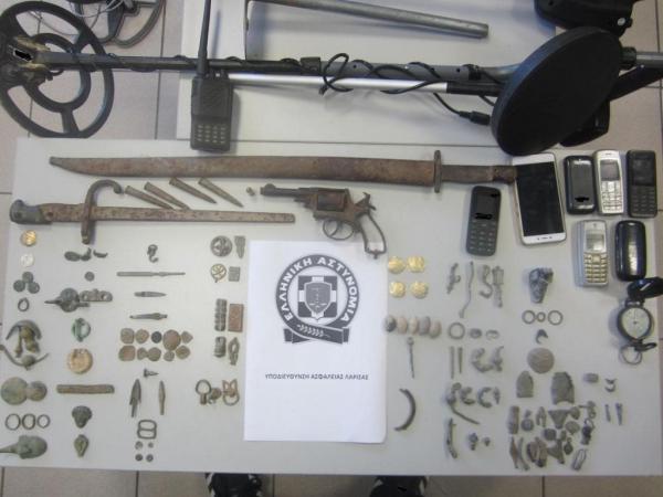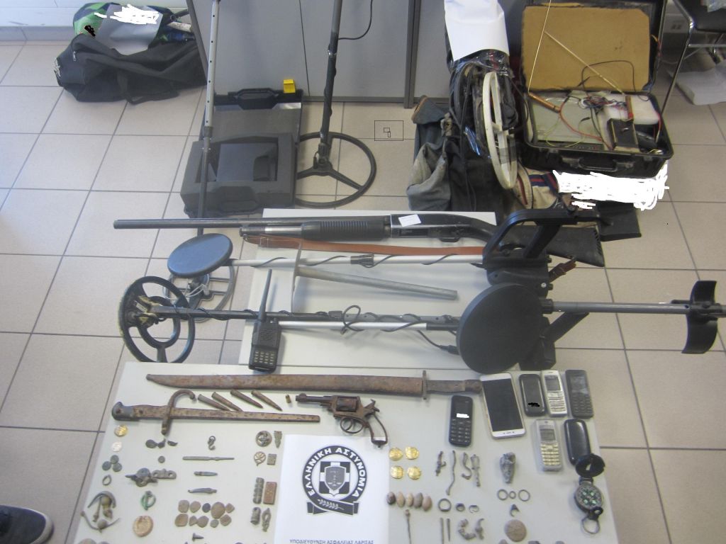 – πλήθος χάλκινων και μεταλλικών κοσμημάτων βυζαντινής, μεταβυζαντινής και αρχαίας εποχής, – τρεις πλήρεις ηλεκτρονικές συσκευές ανίχνευσης μετάλλων, – μία πλήρης παλμική συσκευή ανίχνευσης μετάλλων, – μία αυτοσχέδια ράβδος ανίχνευσης μετάλλων, – εννέα ανιχνευτές μετάλλων, – τέσσερα σκεπάρνια, – ένας φορητός ασύρματος, – ένα συχνόμετρο με τα παρελκόμενα καλώδια, – μία πυξίδα, – ένα περίστροφο, μη λειτουργικό, – μία επαναληπτική καραμπίνα, – ένα μεταλλικό ξίφος, – μία ξιφολόγχη πολεμικού όπλου, – πέντε φυσίγγια πυροβόλου όπλου και – επτά κινητά τηλέφωνα.