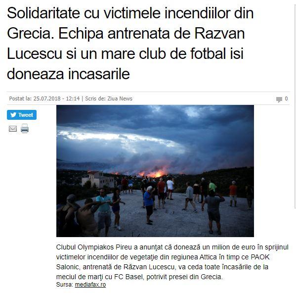 Επίσης ιδιαίτερη αναφορά για την προσφορά του Βαγγέλη Μαρινάκη γίνεται και από την ιστοσελίδα ziuanews.ro, η οποία επισημαίνει ότι ο Ολυμπιακός θα δώσει ένα εκατ. ευρώ για την ενίσχυση των πληγέντων ενώ γίνεται αναφορά και στην απόφαση της διοίκησης του ΠΑΟΚ, να προσφέρει τις εισπράξεις από τον χθεσινό αγώνα με την Βασιλεία, για τον ίδιο σκοπό.