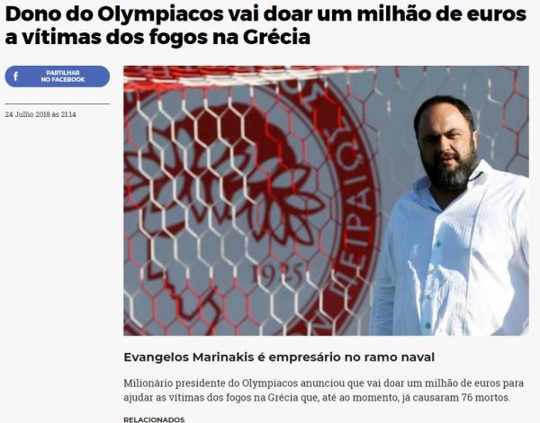 «Ο ιδιοκτήτης του Ολυμπιακού, Βαγγέλης Μαρινάκης θα δώσει ένα εκατομμύριο ευρώ (1,1 εκατ. δολάρια) για να στηρίξει άμεσα τους ανθρώπους που έχουν πληγεί από τις φωτιές».