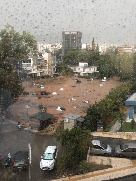 Εικόνες από τα κοινωνικά δίκτυα δείχνουν να έχει πλημμυρίσει χώρος στάθμευσης αυτοκινήτων στη συμβολή των οδών Σωρού και Κηφισίας.