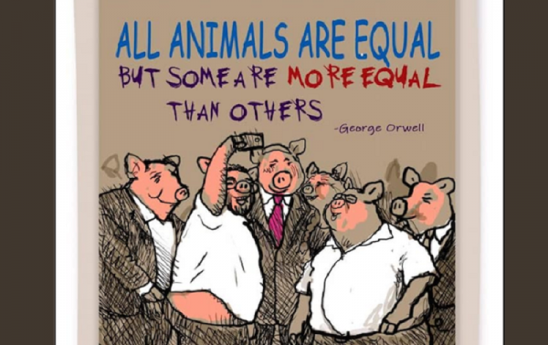 Το σκίτσο συνοδευόταν από τη λεζάντα: «Όλα τα ζώα είναι ίσα, αλλά μερικά ζώα είναι πιο ίσα από τα άλλα», τη γνωστή φράση από το βιβλίο του Τζορτζ Όργουελ «Η Φάρμα των Ζώων».