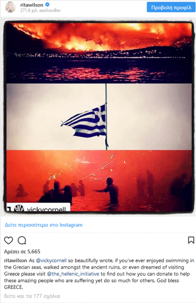 Με μια φωτογραφία που δείχνει τις φλεγόμενες παραλίες της Ανατολικής Αττικής, μια ελληνική σημαία που κυματίζει μεσίστια και ανθρώπους που αναζητούν τη σωτηρία τους μέσα στη θάλασσα, η ηθοποιός απευθύνει έκκληση σε όσους είχαν την ευκαιρία να απολαύσουν κάποτε το κολύμπι στις ελληνικές θάλασσες, να περπατήσουν ανάμεσα στα ερείπια των μνημείων της αρχαιότητας ή λαχταρούν απλώς να επισκεφθούν τη χώρα μας, να επισκεφθούν το λογαριασμό του The Hellenic Initiative, για να προβούν σε μια δωρεά για τα θύματα της καταστροφής.