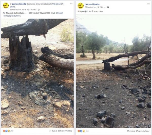 Αλλά ας πάμε στη φωτογραφία – ντοκουμέντο της εφημερίδας Εθνος που αποδείκνυε ότι πρόκειται περί εμπρησμού. Σύμφωνα με το δημοσίευμα η φωτογραφία με το γκαζάκι προέρχεται από την ανατολική Αττική. Όμως, αποκαλυπτικά είναι όσα λέει κάτοικος της περιοχής της Κινέτας ο οποίος είδε τη φωτογραφία. Ο κύριος Δημήτρης Πολυχρόνης κάτοικος της περιοχής και ιδιοκτήτης του Cafe Lemon Bistro τράβηξε φωτογραφίες στις οποίες περιλαμβάνεται και η «αποκλειστική» που είχε το Εθνος. Οι φωτογραφίες αναρτήθηκαν στο fb από την περασμένη Τετάρτη κι όπως αναφέρει ο Πολυχρόνης, προέρχονται από τον οικισμό Γαλήνη, πάνω από το κτήμα «Σπύρος Παπαχαραλάμπους».