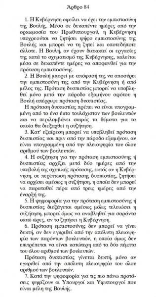 Στο άρθρο 84 του Συντάγματος, το οποίο συνδέεται με την ανάληψη πολιτικής ευθύνης και από τις παραγράφους 2 έως την παράγραφο 7 , ερμηνεύει, βάσει του συγγραφέα, πώς οργανώνεται η πτώση, η παραίτηση της κυβέρνησης ως αποτέλεσμα της ομολογίας πολιτικής ευθύνης.