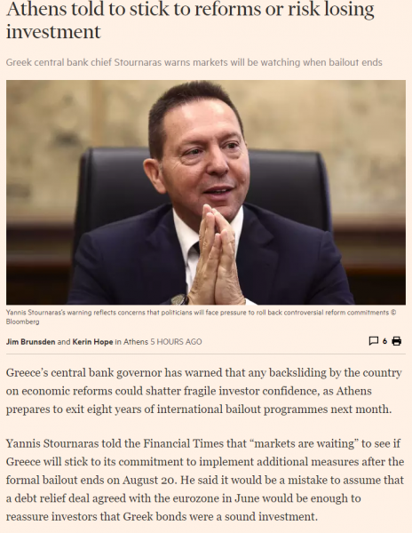 Ο διοικητής της ΤτΕ επισημαίνει σε συνέντευξή του στους Financial Times ότι «από τη στιγμή που θα είμαστε μόνοι μας οι αγορές θα ακολουθήσουν μια σκληρή προσέγγιση. Θέλουν να δουν πώς θα συμπεριφερθούμε μετά τις 20 Αυγούστου. Θα παρακολουθούν κάθε κίνηση της κυβέρνησης αναφορικά με τις οικονομικές πολιτικές. Αν θεωρήσουν ότι υπαναχωρούμε, θα φύγουν. Αν νιώσουν ότι εκπληρώνουμε τις δεσμεύσεις μας, θα μας δώσουν μια ευκαιρία».